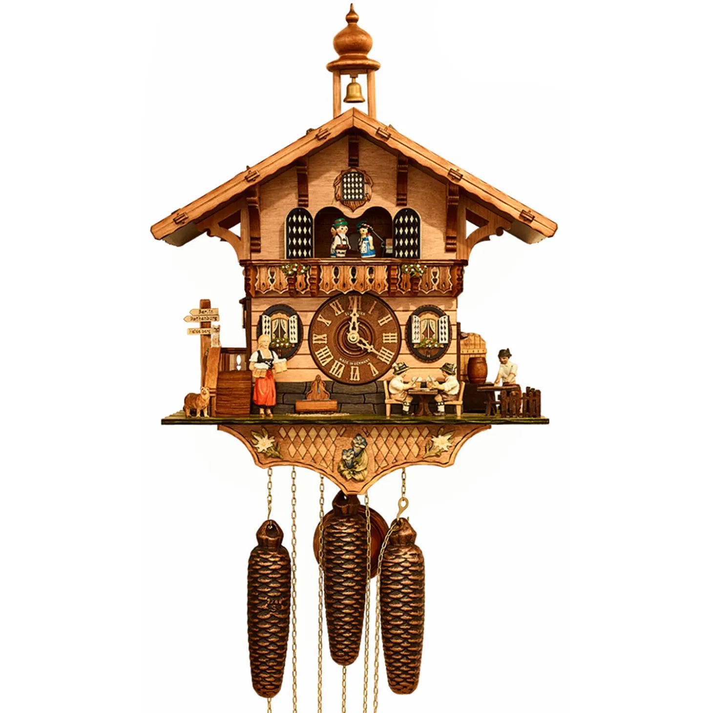 - Die Uhr zeigt eine typische Biergarten-Szene: Zwei bewegliche Kartenspieler sitzen am Tisch und spielen Karten. Die Bedienung kommt gerade aus dem Wirtshaus und bringt frisches Bier.