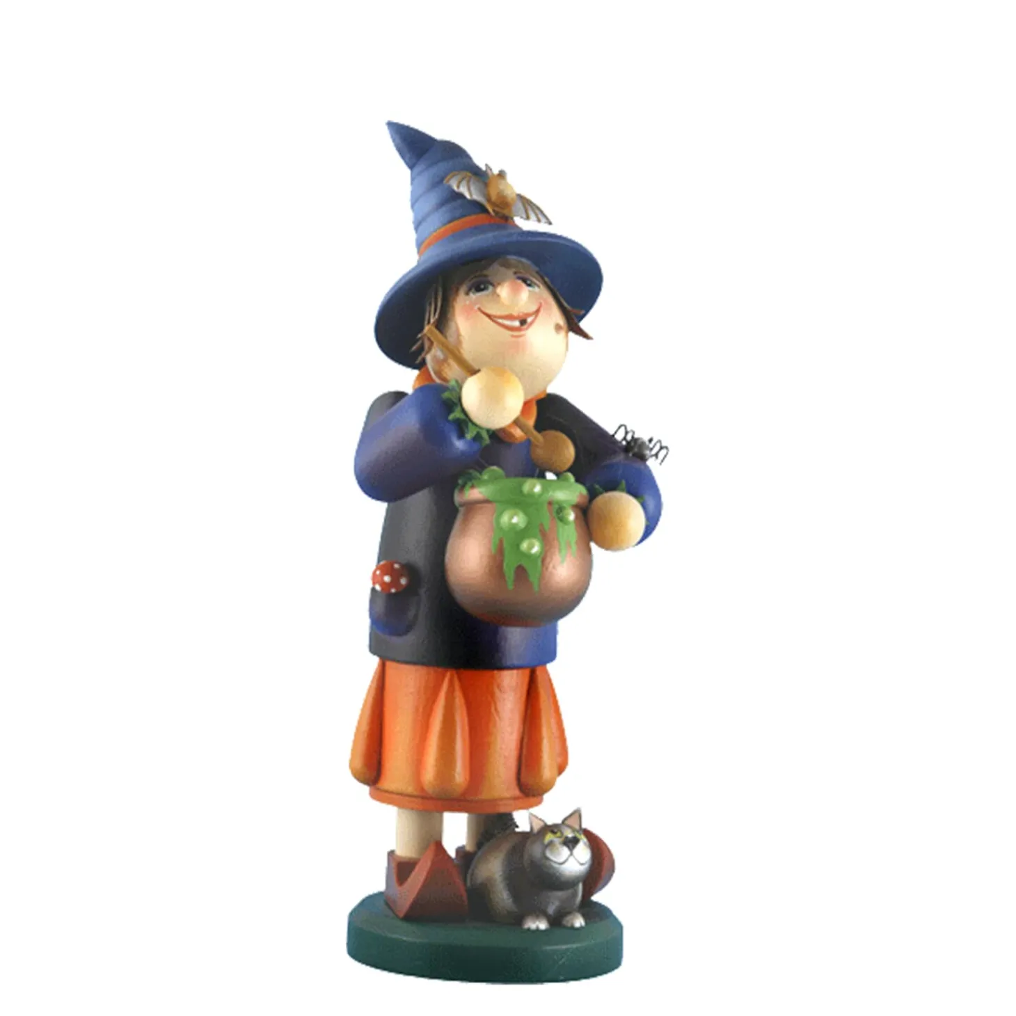 Die freundlich lächelnde Hexe braut in ihrem großen Zaubertopf einen giftgrünen Trank. Kräuter, Fliegenpilze und andere Zutaten sind im Topf gelandet und ein angenehmer Räucherduft strömt aus ihm heraus. Ob der Trank wohl doch gut schmeckt? Ihre schwarze Katze jedenfalls lauert schon auf ein Tröpfchen des Zaubertranks. Auf dem spitzen dunklen Hexenhut hat es sich eine Fledermaus gemütlich gemacht und eine schwarze Spinne klettert auf ihren Arm. Etwas schaurig – aber auch bezaubernd.