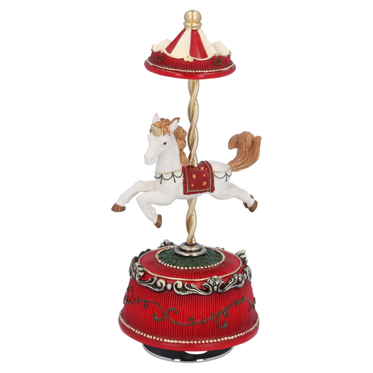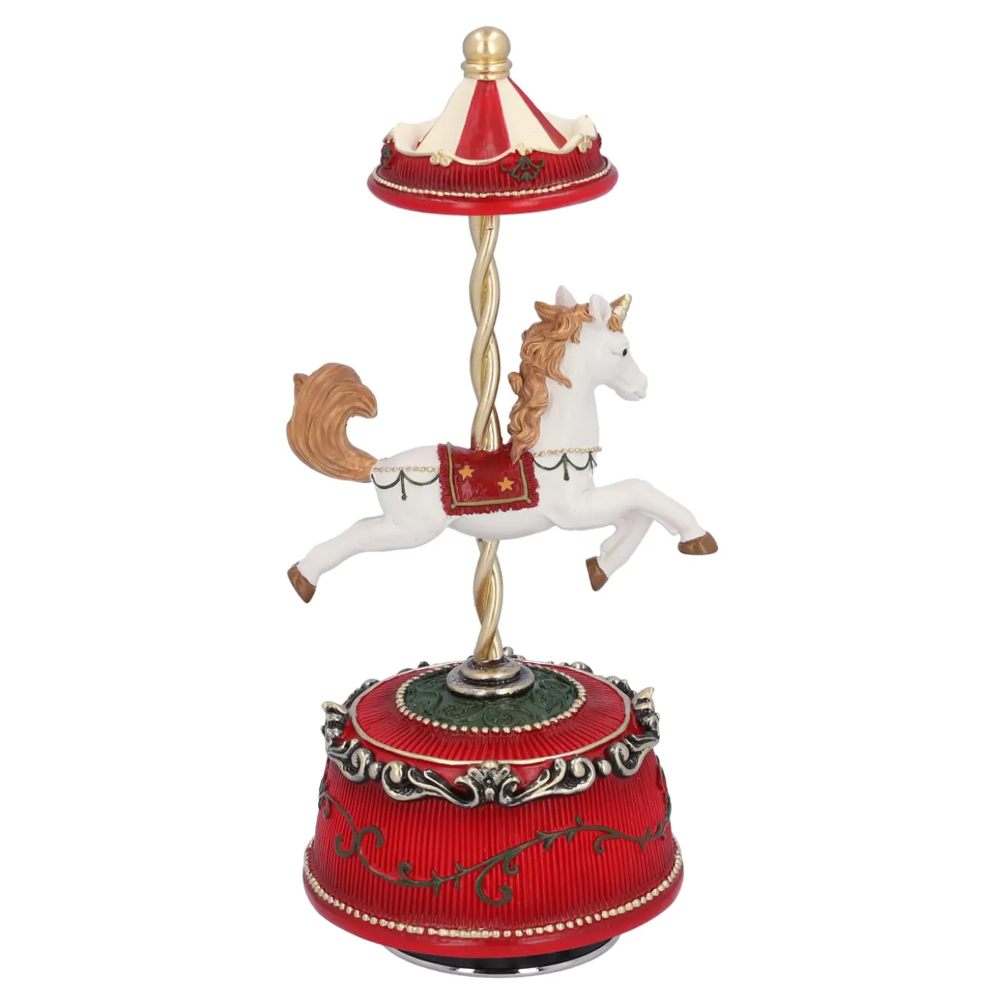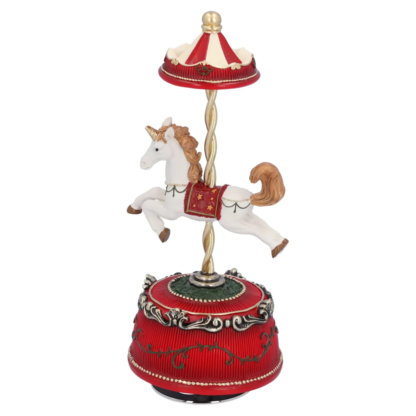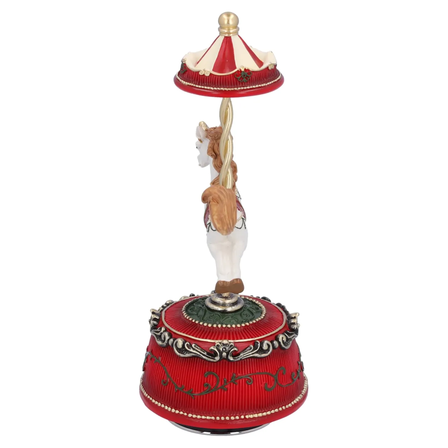 Mit seinem anmutigen Pferd, dem geschwungenen Baldachin und den liebevoll gestalteten Details fängt diese Musikdose die nostalgische Magie eines historischen Jahrmarkts ein. Beim Aufziehen erklingt die Melodie „It’s a small World“ – und das Pferd beginnt sich zu drehen.