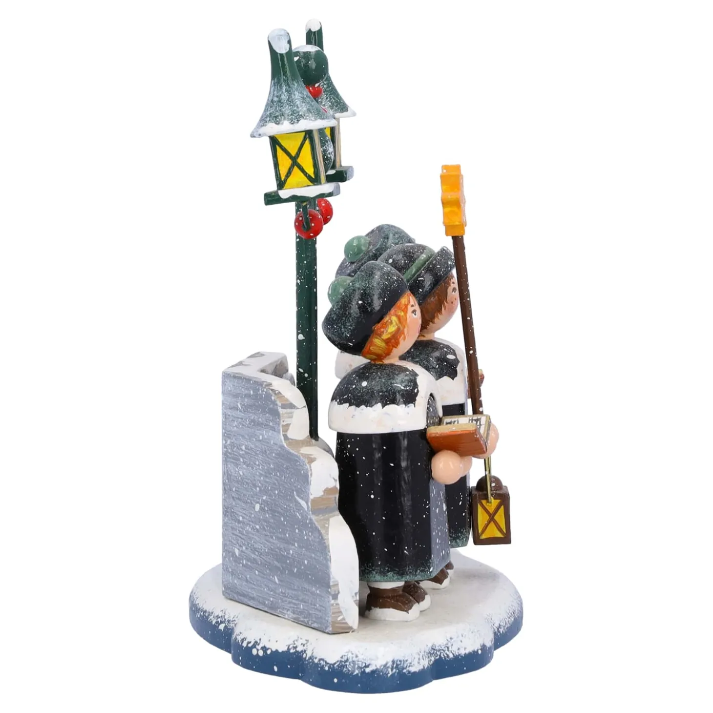 Ein schöner Anblick in Ihrem kleinen Winterdorf sind die Kinder der Kurrende. Auch an kalten Winterabenden stehen sie in der Adventszeit im Laternenlicht und erfreuen die Leute auf den Straßen mit den schönsten Weihnachtsliedern. Die kleinen Sänger sind in die klassischen schwarzen Umhänge gehüllt und tragen runde schwarze Kopfbedeckungen. Der Junge in der Mitte trägt traditionell einen Sternenstab und seine Laterne leuchtet mit warmem Licht. Die singenden Mädchen an seiner Seite halten zudem ein Gesangsbuch in ihren Händen. Eine bezaubernde Szenerie in Ihrer Winterwelt!