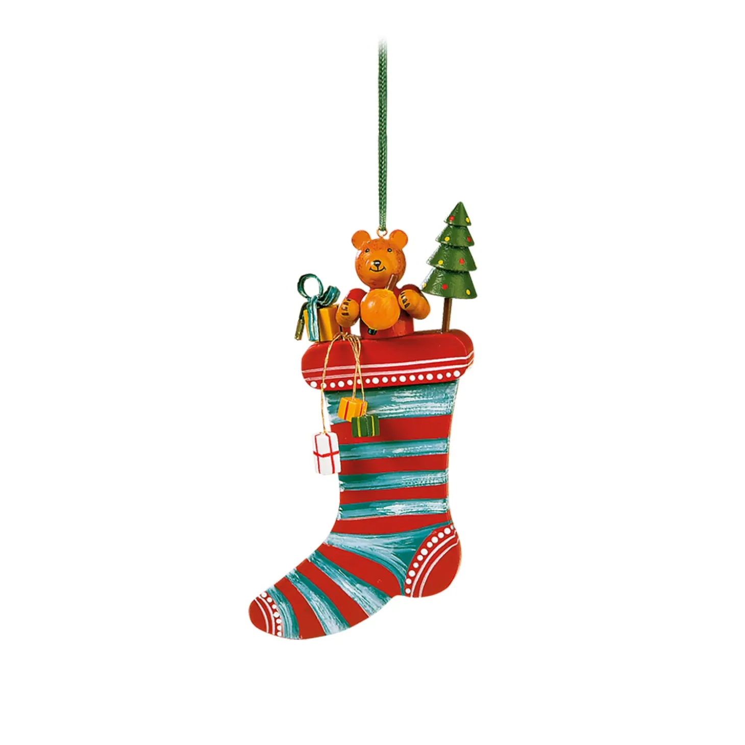 Der blau-rot gestreifte Nikolausstrumpf ist randvoll gefüllt mit kleinen Nikolausgeschenken. Oben schaut ein freundlicher Teddybär, ein kleines Geschenk und ein kleiner Christbaum heraus.