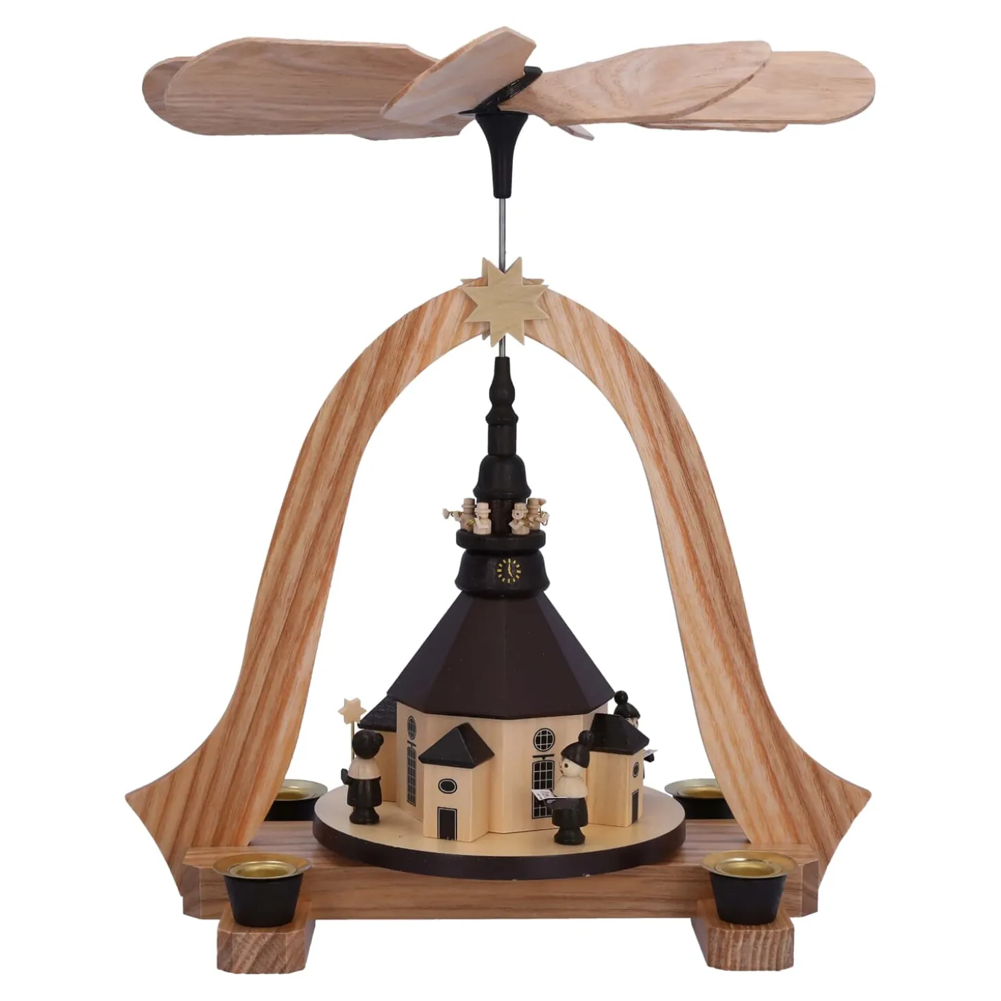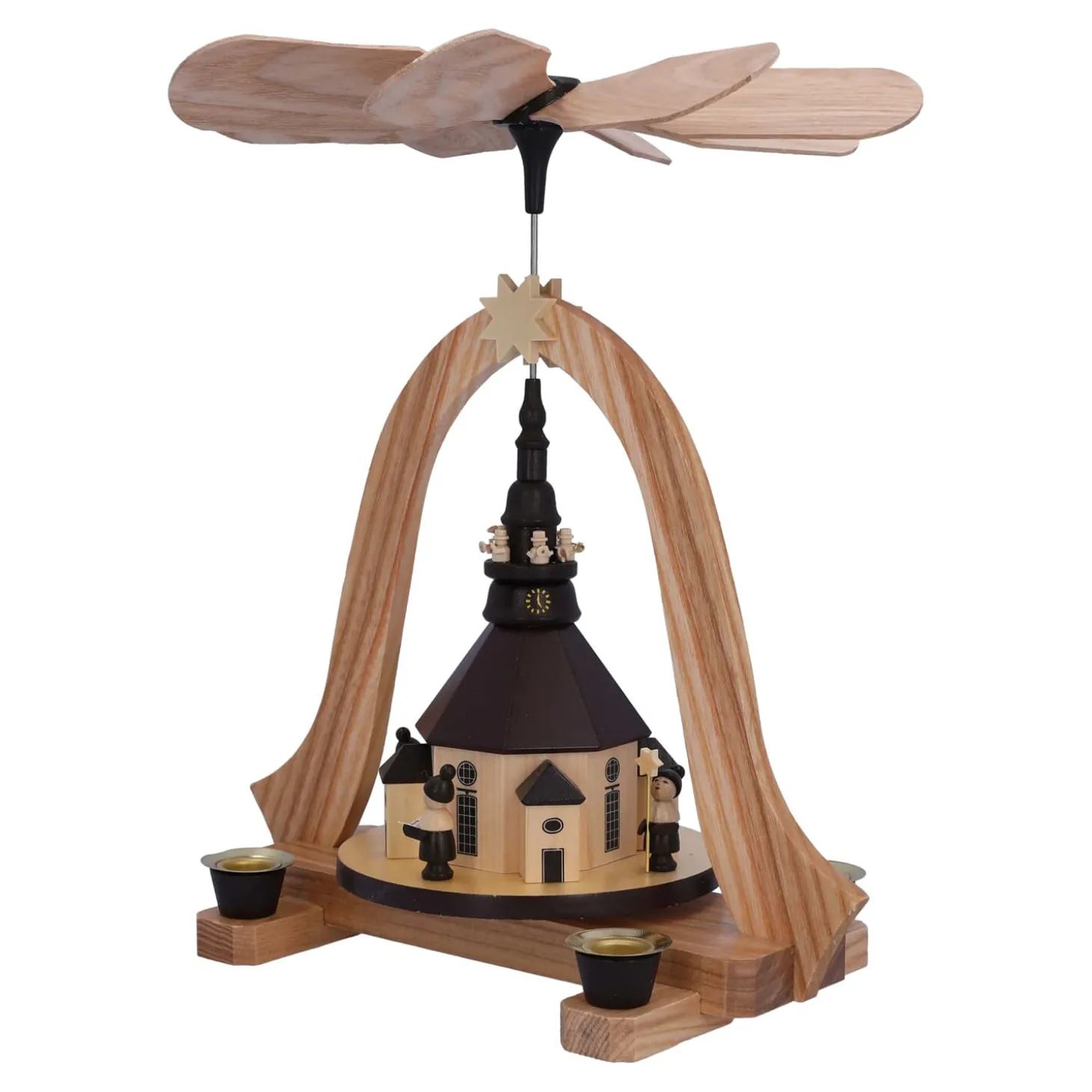Eine der schönsten Weihnachtstraditionen sind Pyramiden und die Geschichten die sie erzählen. Das durch Kerzenwärme angetriebene Flügelrad zaubert ein wunderbares Spiel aus Licht und Schatten an Decken und Wände.