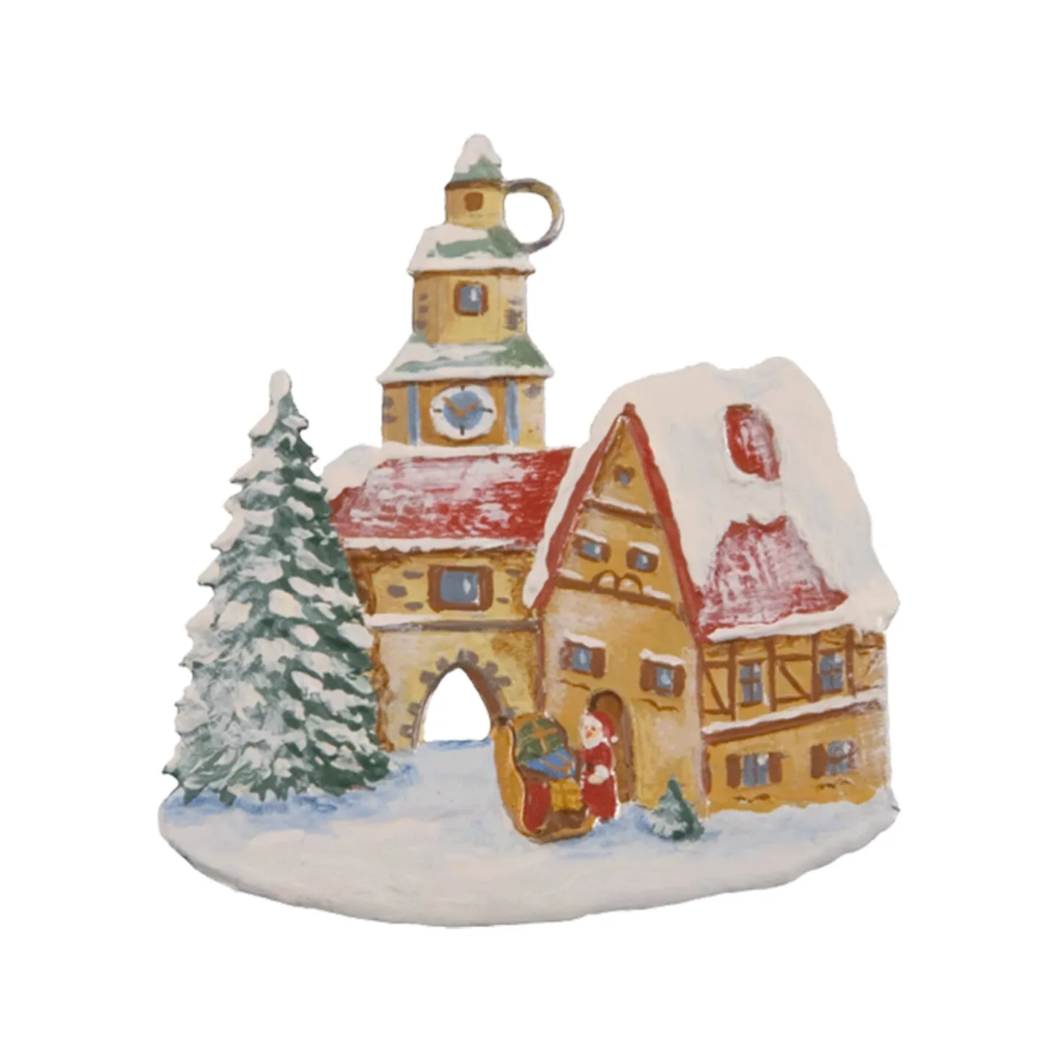 Ein Hauch von Winterzauber für Ihren Baum: Dieser detailreiche Zinn-Baumbehang zeigt eine verschneite Altstadtszene mit Fachwerkhaus, Tannenbaum und einem Weihnachtsmann, der Geschenke verteilt. Die liebevolle Handbemalung verleiht jedem Stück seinen eigenen Charakter und bringt die warme Stimmung eines winterlichen Dorfes zum Leben.