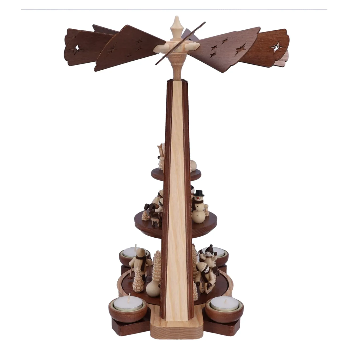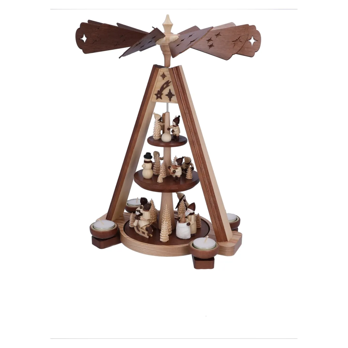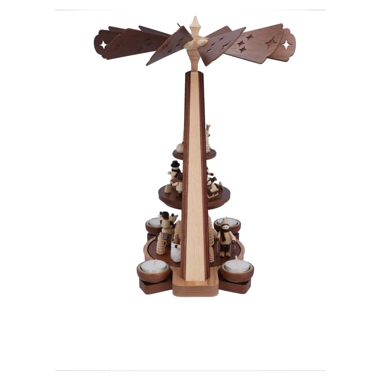 Eine der schönsten Weihnachtstraditionen sind Pyramiden und die Geschichten die sie erzählen. Das durch Kerzenwärme angetriebene Flügelrad zaubert ein wunderbares Spiel aus Licht und Schatten an Decken und Wände.