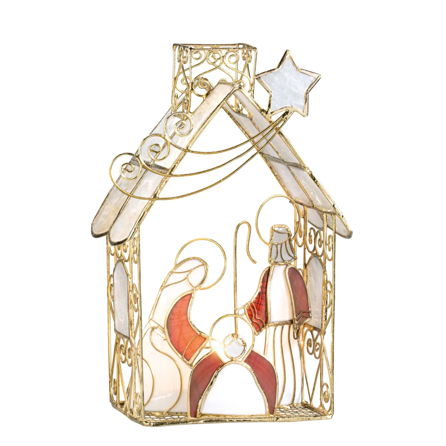 Zart und filigran erzählt diese Krippenszene aus schimmerndem Perlmutt mit goldfarbenen Akzenten von der stillen Magie der Heiligen Nacht. Umrahmt von der kunstvoll gestalteten Krippe strahlen Maria, Josef und das Jesuskind eine anmutige Leichtigkeit aus. Im Zentrum findet ein kleines Teelicht seinen Platz, dessen sanfter Schein die Szene in einen warmen, festlichen Glanz taucht.