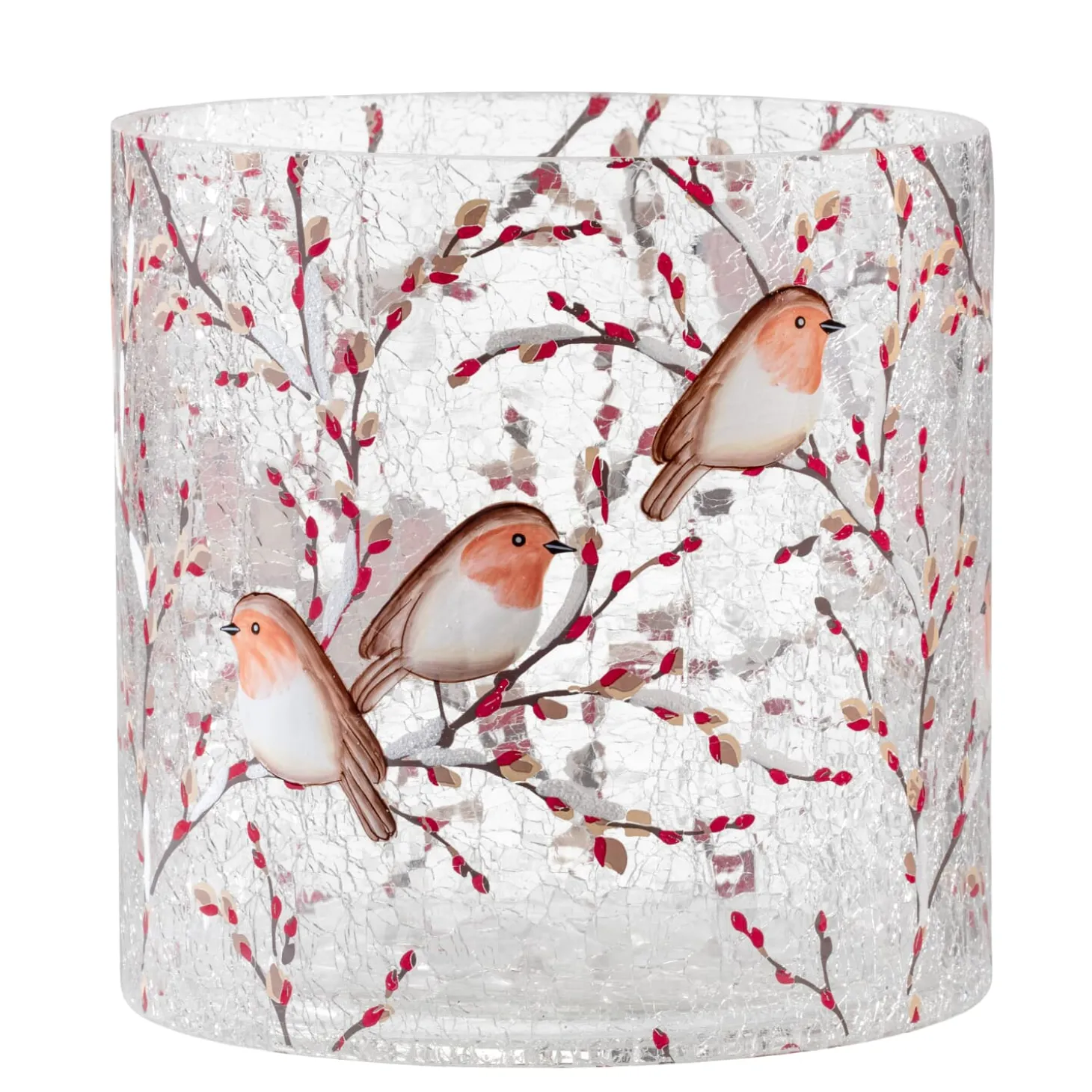 Kleine Rotkehlchen haben auf zarten Zweigen Platz genommen und tauchen das Windlicht in einen Hauch von winterlicher Stille. Sobald das Kerzenlicht durch das fein craquelierte Glas schimmert, entfaltet sich ein zauberhaftes Spiel aus Licht und Schatten – wie funkelnder Raureif, der im ersten Morgenlicht glitzert. Die liebevolle Gestaltung der Vögel, das Spiel aus Licht und Struktur sowie die filigranen Beerenzweige machen dieses Windlicht zu einem echten Blickfang – ideal, um in der kalten Jahreszeit Wärme und Geborgenheit zu schenken.