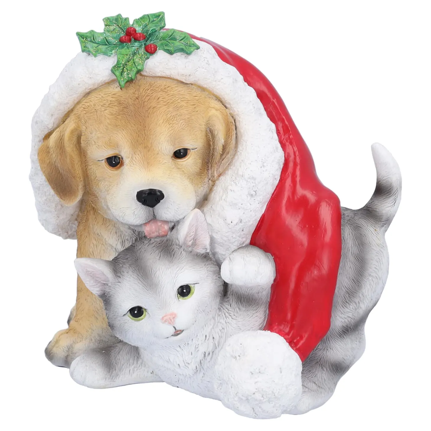 Diese entzückenden Haustiere begrüßen mit Freude die kalte Jahreszeit. Beide verstecken sich unter einer roten Bommelmütze und wärmen sich gegenseitig vor der drohenden Kälte.