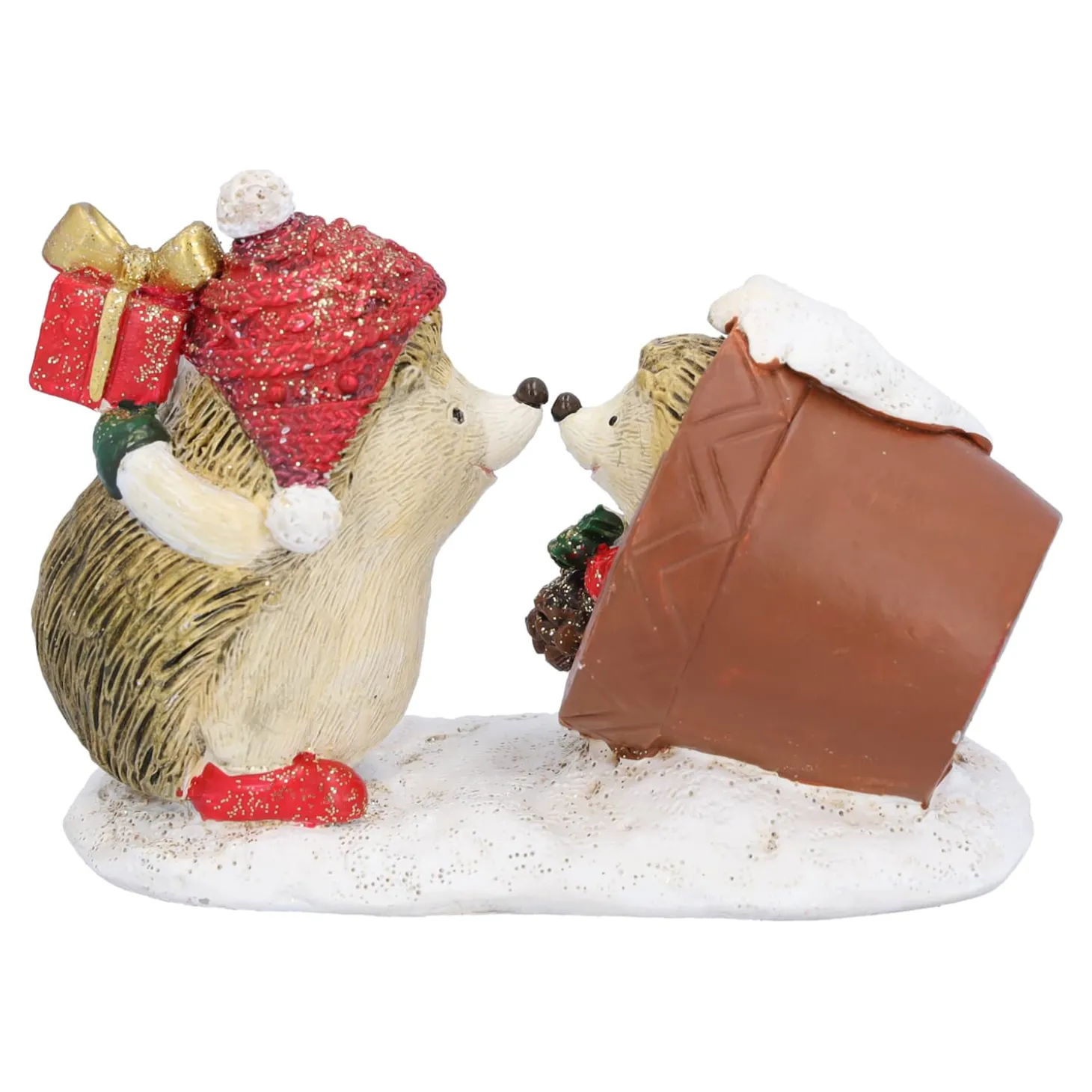 Dieses niedliche Igel-Duo trifft sich zu einem besonderen Weihnachtsmoment: Während der eine Igel sich gemütlich in einem kleinen Tontopf versteckt, bringt der andere, festlich gekleidet mit Mütze und Handschuhen, ein liebevoll verpacktes Geschenk. Mit den winterlichen Accessoires versprühen sie fröhliche Festtagsstimmung. Ein bezaubernder Hingucker, der den Zauber des Schenkens auf charmante Weise einfängt!