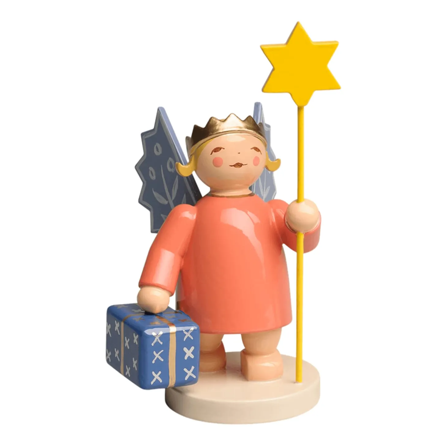 Blaue Flügel, knielanges Kleid, blonder Schopf – so präsentieren sich die himmlischen Kronenengel. Ihren Namen verdanken Sie der goldfarbenen Krone, die ihren Kopf schmückt. Olly Wendt (geb. Sommer), kreative Gestalterin an Grete Wendts Seite, entwarf diese anmutige und zugleich kindlich-fröhliche Figurengruppe bereits vor 1937. Nach fast 80 Jahren kehren die Kronenengel ins Sortiment zurück.