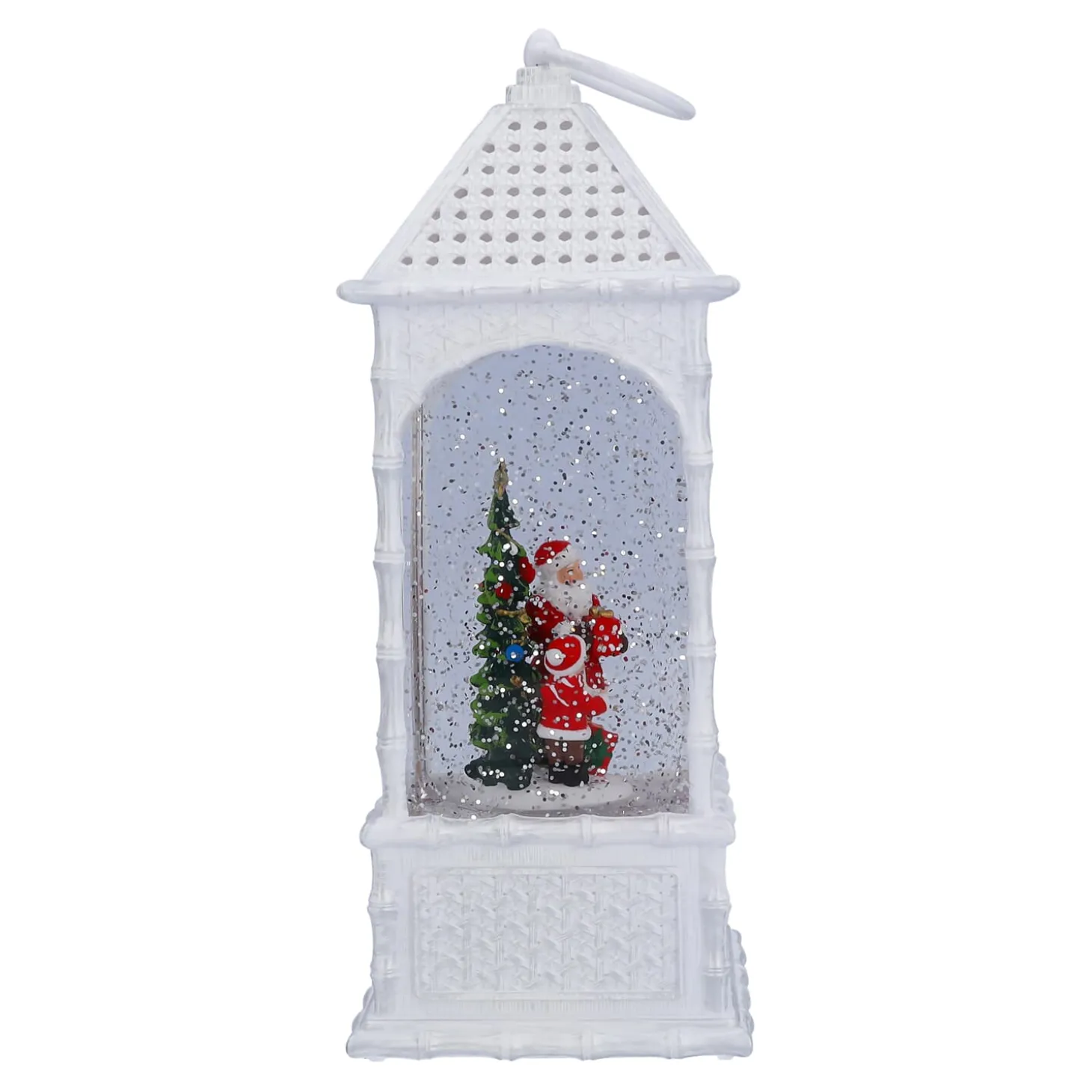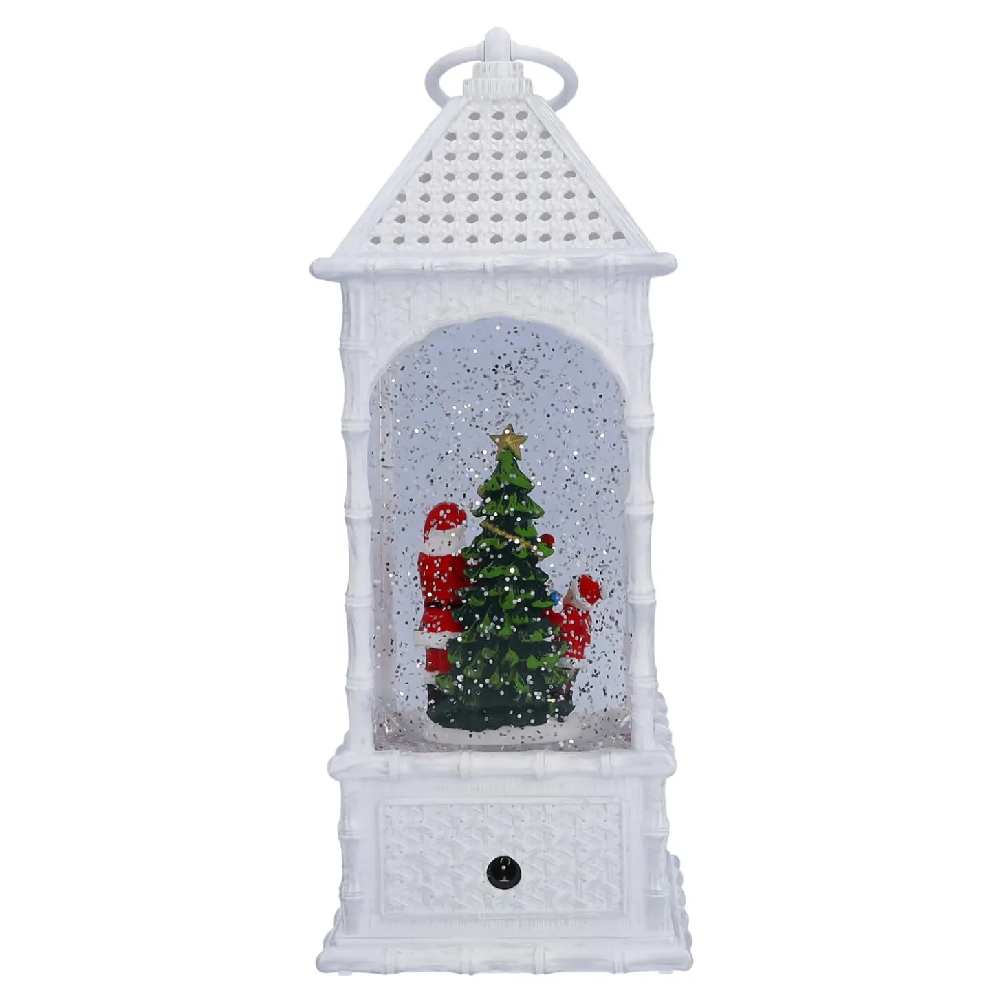 Diese wassergefüllte LED-Laterne aus Kunststoff und Plexiglas bringt mit ihrem automatischen Schneegestöber eine zauberhafte Winterwelt in Ihr Zuhause. In der funkelnden Schneelandschaft überreicht der Weihnachtsmann einem Kind ein Geschenk, während ein festlich geschmückter Baum die Szene erhellt. Die warmweiße LED-Beleuchtung und die sanft wirbelnden Schneeflocken machen diese Laterne zu einem wunderschönen Highlight für Ihre Weihnachtsdekoration, die festliche Magie verbreitet.