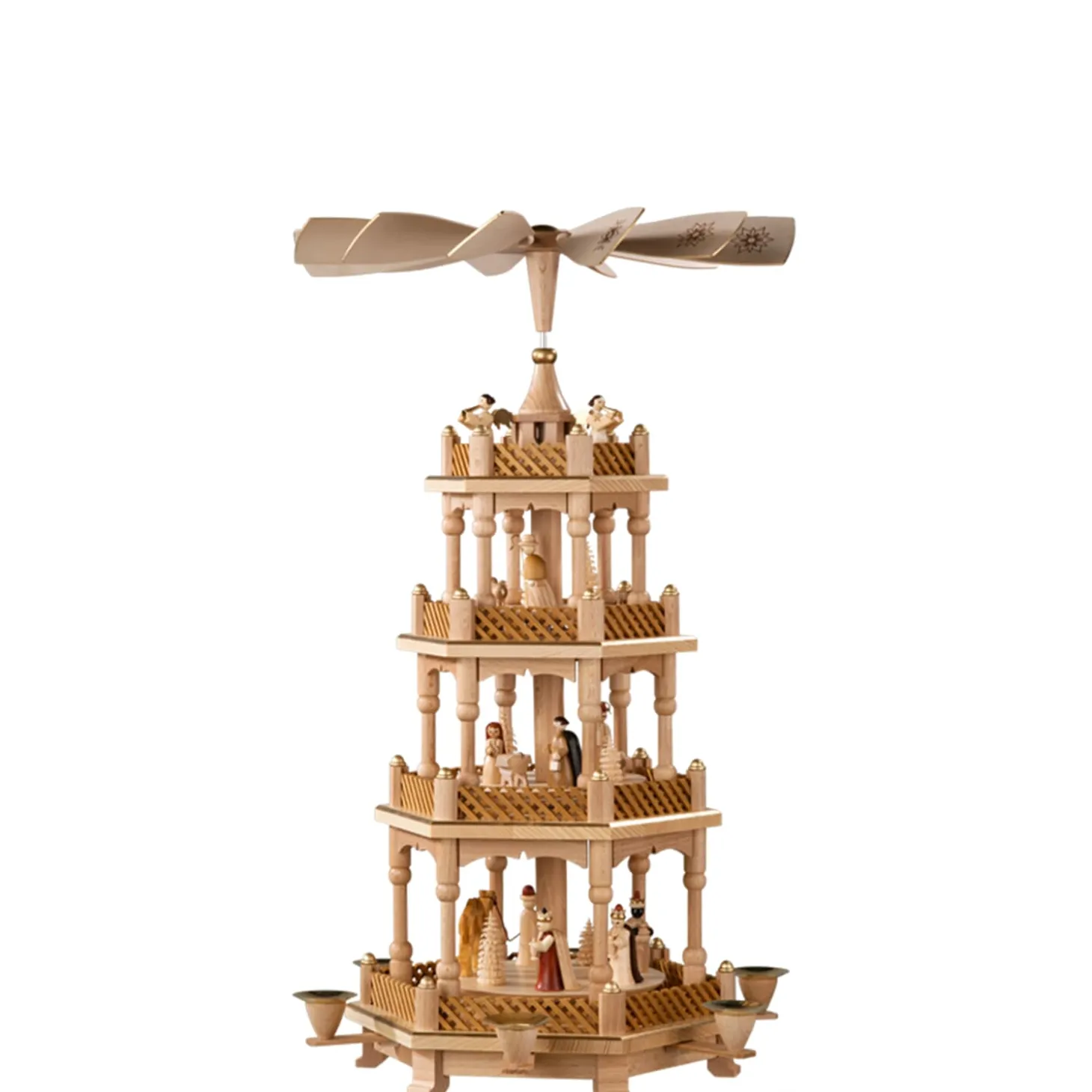 Eine der schönsten Weihnachtstraditionen sind Pyramiden und die Geschichten die sie erzählen. Das durch Kerzenwärme angetriebene Flügelrad zaubert ein wunderbares Spiel aus Licht und Schatten an Decken und Wände.