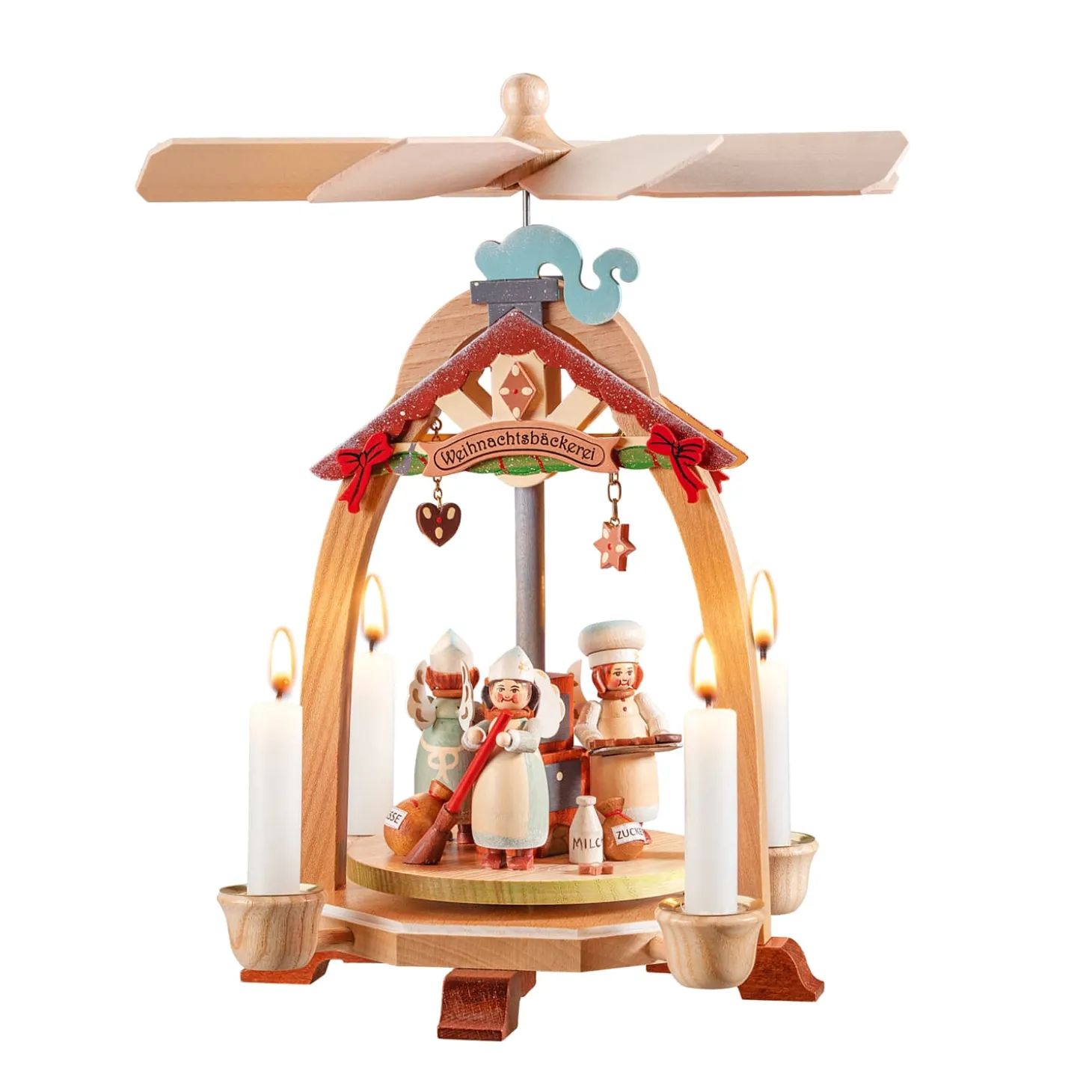 Es ist so weit – die Weihnachtsbäckerei in der zauberhaften Weihnachtspyramide hat geöffnet! Rund um den Backofen tummeln sich drei fleißige Engel, die mit roten Bäckchen und glänzenden Augen ihre kleinen Köstlichkeiten herstellen. Diese kleine, liebevoll zusammengestellte Szene dreht sich ruhig im Licht von vier Kerzen, sodass man das rege Treiben in der Backstube von allen Seiten sehen kann. Diese hochwertige Dekoration aus der Rothenburger Weihnachtswerkstatt ist ein liebevoll verspieltes Element für Ihre Winterdekoration – ideal für alle, die die beruhigende Wirkung einer klassischen Weihnachtspyramide schätzen.