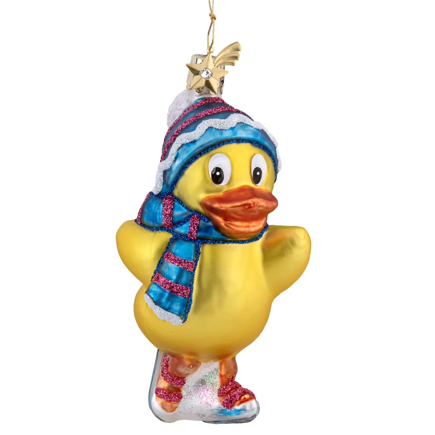 Schlittschuhfahren kann ganz schön tückisch sein. Das glatte Eis stellt für den ein oder anderen nicht selten ein Problem dar. Nicht jedoch für Schnatterinchen! Die kleine, gelbe Ente saust mit Schlittschuhen, Schal und Mütze gekonnt übers Eis und lässt die schnelle Fahrt kinderleicht aussehen.