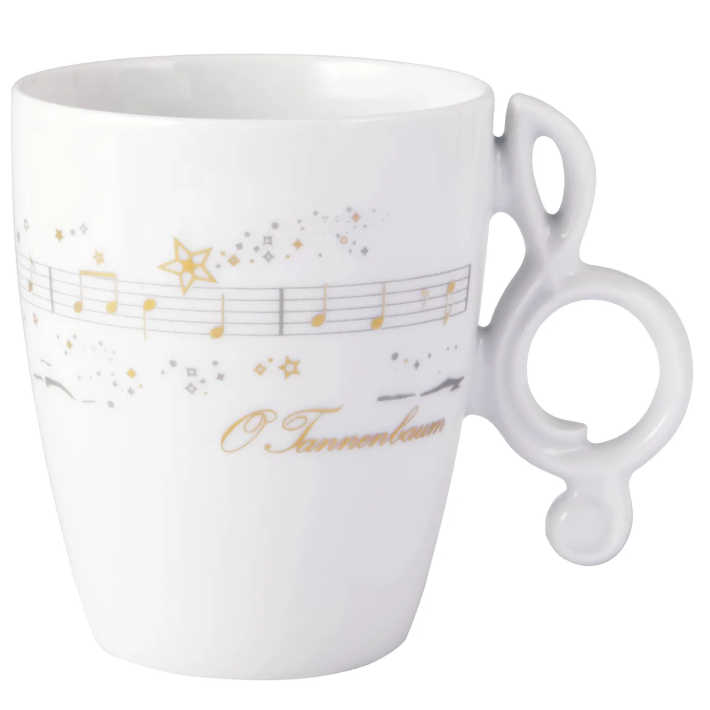Die aufwändig gearbeitete Tasse, die sich in Form und Dekor verewigt die sanfte Melodie von „O Tannenbaum“ auf feinstem Meissener Porzellan.“ Auffällig ist der als Violinschlüssel gearbeitete Tassengriff.