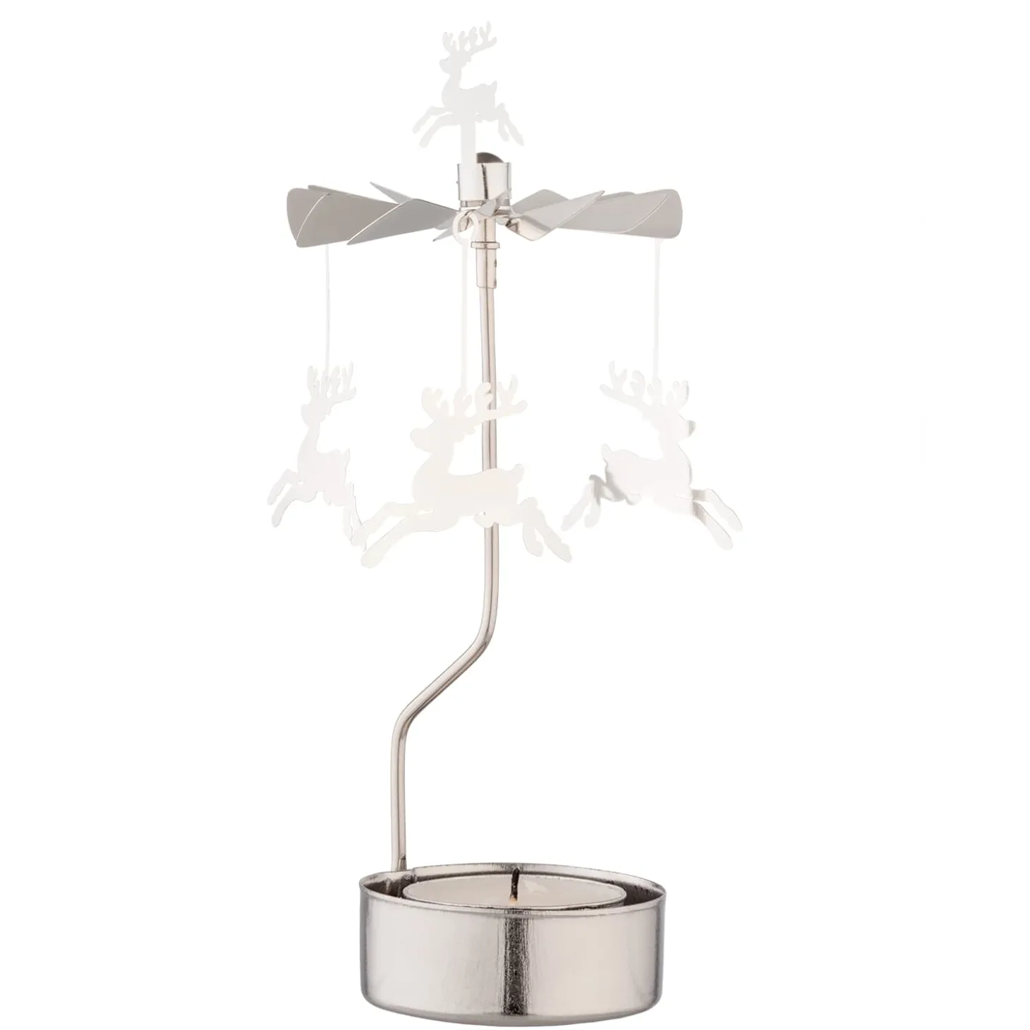 Sobald das Teelicht entzündet ist, schweben die Rentiere durch die winterliche Nacht. Ein wahrlich glanzvoller Auftritt für das nostalgische Teelicht-Karussell mit großer Wirkung für ein gemütliches Zuhause in der Adventszeit!