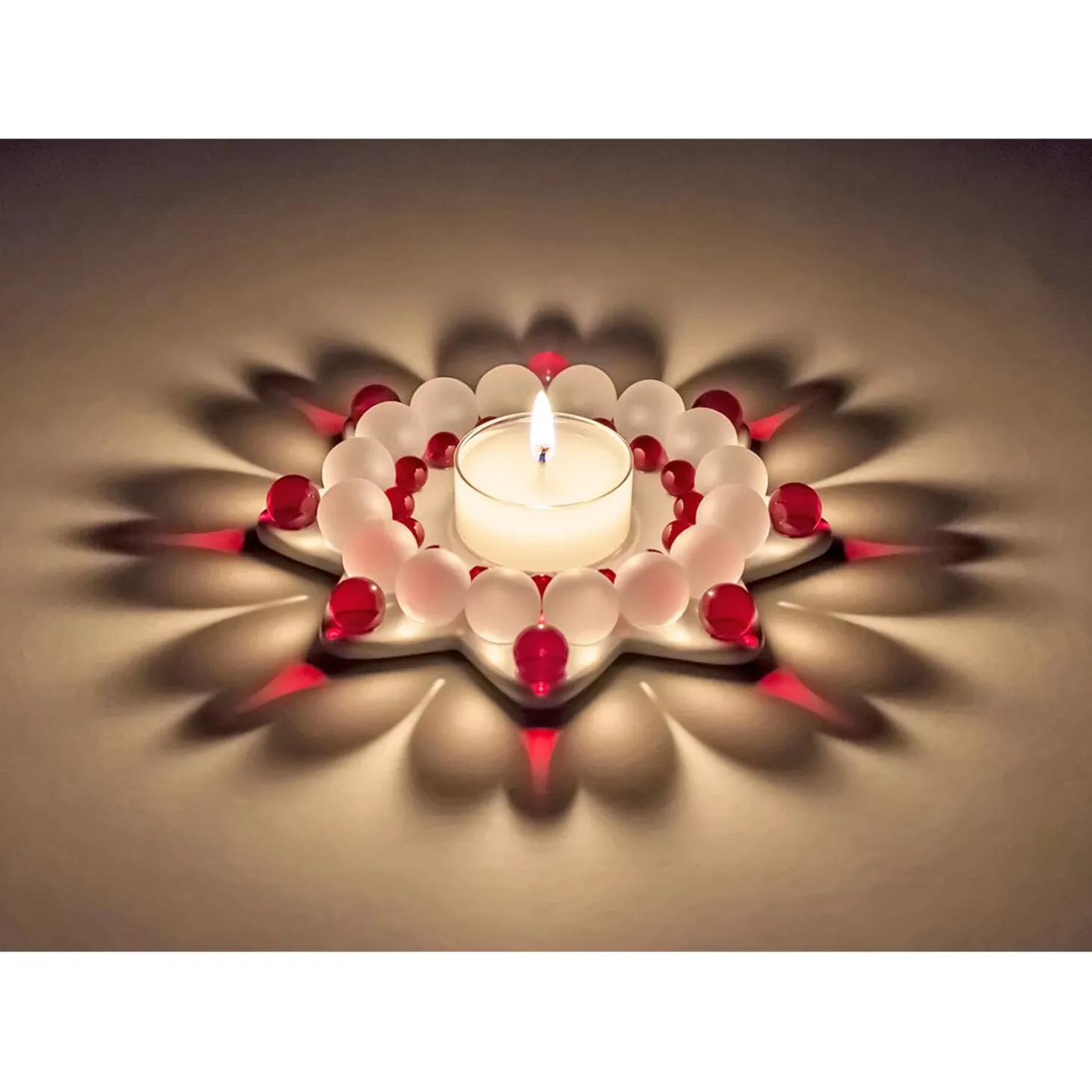 Wird ein Teelicht entzündet, entfaltet der Stern seine wahre Magie: Die transparenten und matten Perlen brechen das Licht auf zauberhafte Weise und tauchen die Umgebung in ein warmes Spiel aus Farbe, Glanz und Schatten. So entsteht eine stimmungsvolle Atmosphäre, die Geborgenheit und Weihnachtsfreude ausstrahlt.